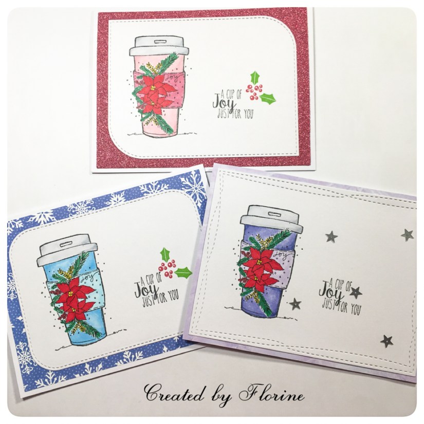 Onto my next cards! This beautiful stamp is from Unity Stamp Company, which I won from a giveaway. I stamped them on three card panels and colored them with Copic makers. Die cut the panels using different frame dies. And choose my pattern/background paper to match the color of the cups! I added some star sequins on the purple one but I’m not too happy with it but didn’t want to remove the stars so I left it the way it is. For the two other cards, I added some berries and leaves from Hero Arts Joy stamp set.