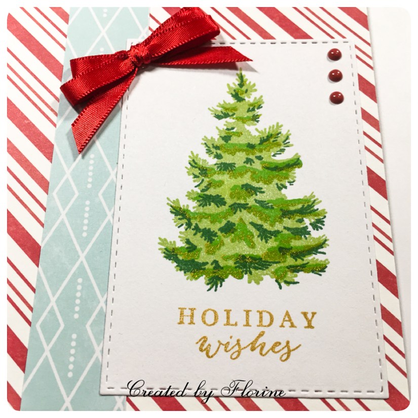 For my third set of cards, I used this Hero Arts Color Layering Christmas Tree that I bought more than a year ago but haven’t used it (I bet you can relate to that as well haha) I choose the green inks from Lawn Fawn that I wanted to use and stamped them. After my third layer, it looked a bit boring so I took my Delicata Silvery Shimmer and Golden Glitz and stamped the fourth layer on it and it looked complete now!! I die cut the card panels using Katscrappiness stitched dies and My Favorite Things Wonky Stitch Lines. Choose some “candy cane” pattern paper as my background and adhered it on the card base. And cut out some pattern papers that I thought it goes well together, adhered it and then adhered the Christmas tree panels. I added bows and some Nuvo drops and they were complete!