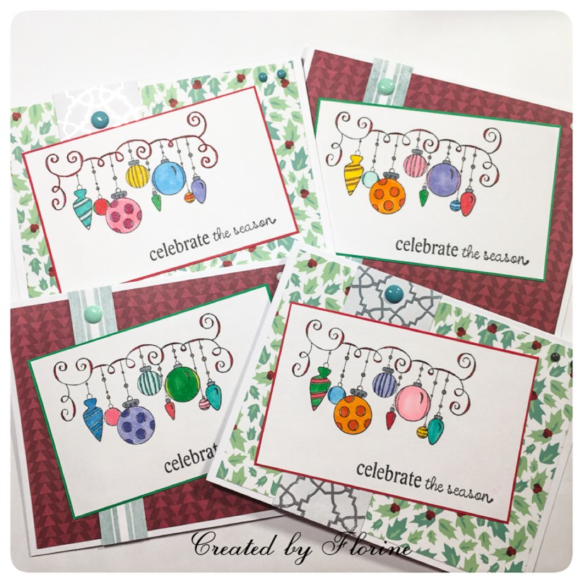 For my fourth set of cards, I used Ornamental Season from Unity Stamp Company. Stamped onto 4 card panels, I colored them a few weeks back during the coloring challenge from Kathy. Adhered them onto green and red card stock that is slightly larger than the panel itself. Chose my pattern paper, trimmed them down to 4×5.25inch because I wanted a white border. Added a strip of pattern paper and adhered my stamped panel on top. Since the image was kinda “busy” already, I only added a few enamel dots and they were done!