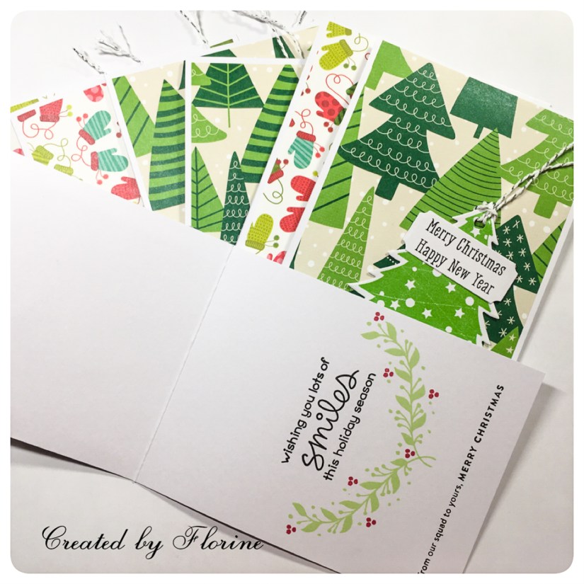 Let me start with the simple ones, I made around 30 of these, mainly were sent to families and some friends. I stamped out the ornaments from Hero Arts card kit from last year with Lawn Fawn inks, die cut them with the coordinating dies and added twines. I told myself earlier this year, FLO!! You have so many paper pads and you keep on buying them but barely use them. You better use them ASAP! And so I’ve chose some pattern papers and trimmed them down to 4×5.25inch. Glued them onto my card base and then the ornament. The kit came with some small “label” dies, I die cut around 30 of them, used the sentiments that came with the kit. Adhered the small labels onto my ornaments and voila! Cards are done!! Ehhh no not yet! I actually stamped the inside of the card at the end, choose two sentiments. One is from Lawn Fawn Merry Messages and the one on the bottom is from Simon Says Stamp Christmas Squad. Green garland is from Altenew Happy Dreams. The red dots are from Simon Says Stamp Mandy’s Flowers, in case you wanted to know haha XD