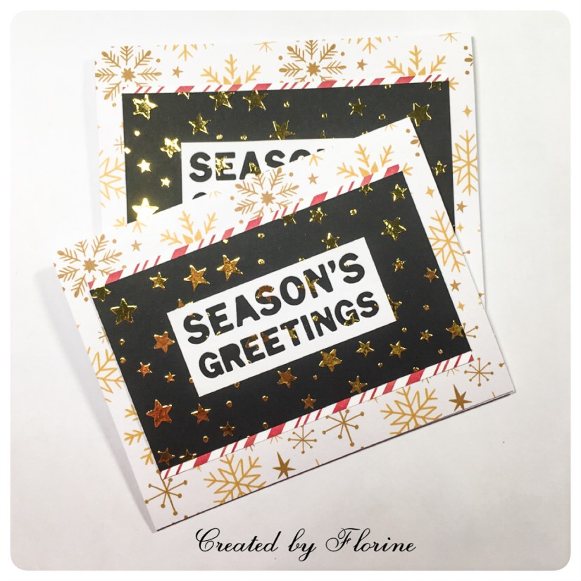 For my sixth set of cards, these were fast ones. For the gold stars on the black card stock, I had used Deco Foil Transfer Gel over a Hero Arts stencil and then used gold foil over it. It was so much fun peeling off the foil to see the results. Trimmed my black panel into 2.75×4.75inch, adhered onto my “candy cane” pattern paper where top and bottom were showing, about 0.25inch. Adhered that on my favorite snowflake pattern paper and then onto my card base. For the sentiment, I used this Season’s Greetings die, trimmed it down and just adhered on the black card stock and we are done with this one! Phew!!
