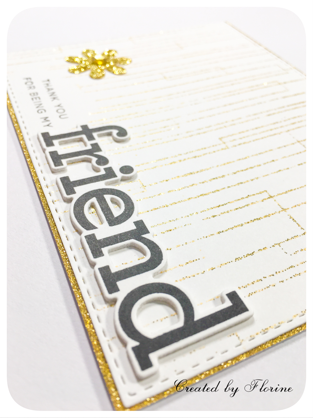 4. I adhered the white panel on a gold glitter card stock and adhered it on my base. Stamped the sentiment “thank you for being my” on the bottom and adhered “friend” next to it. Finished it off by adding a gold flower embellishment from The Paper Studios.