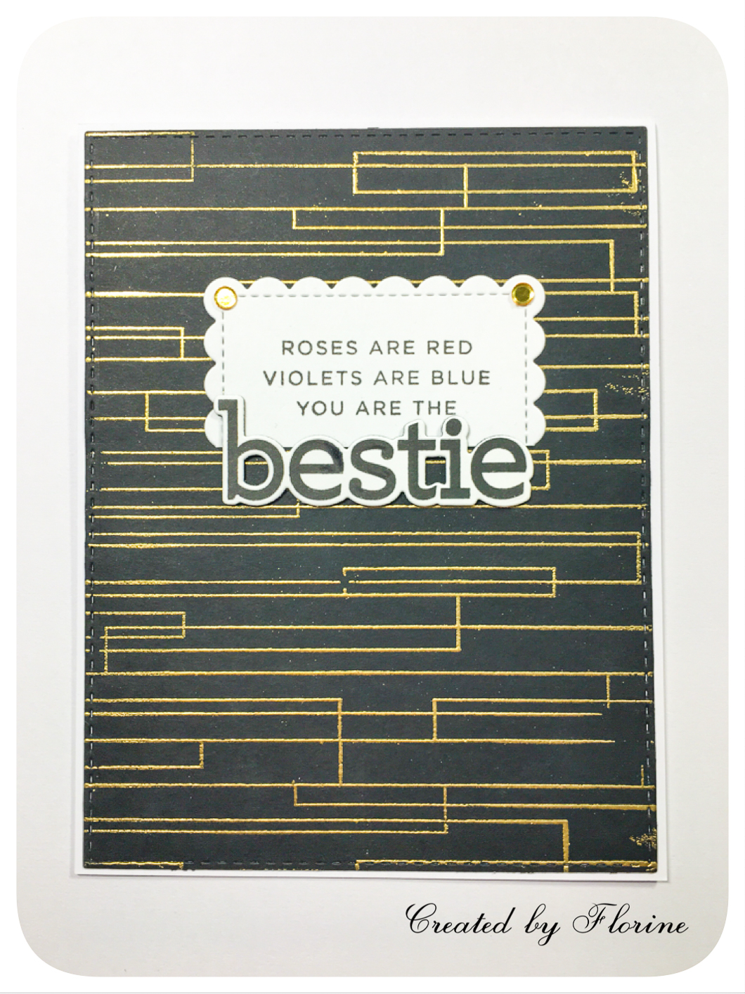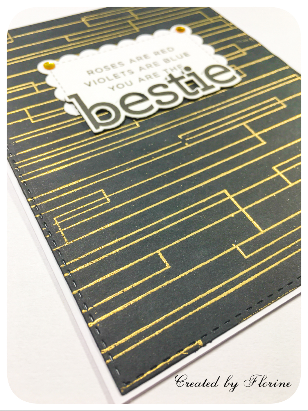 3. For the black panel, I glued on a white base. Used Lawn Fawn stitched scalloped square frame die to die cut a panel where I stamped “Roses are red, Violets are blue, You are the” sentiment. I cut 1/3 of the panel off, adhered it on my card panel and the word “bestie” underneath. To finish it, I added two gold sequins on both upper corners.