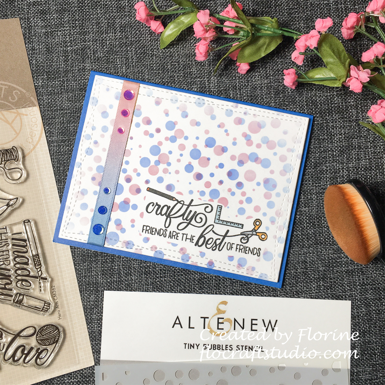 3. I taped my Altenew Tiny Bubbles stencil on the Bristol smooth card panel. Using the super popular make up brush (that I got from Amazon) and started blending in with Distress Oxide Blueprint Sketch. Flipped the stencil and blend Abandoned Coral on my panel. Set it aside for now.