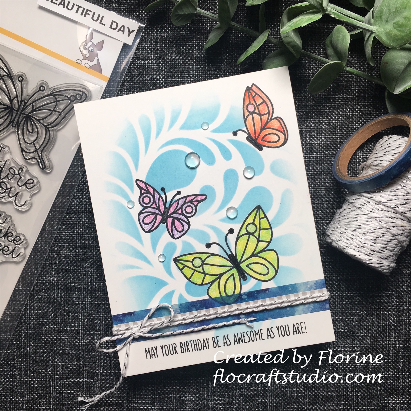 - To finish the card I adhered 3 different sizes of Katscrappiness clear droplets and used Spectrum Noir Sparkle pen to give the butterflies some sparkle!
