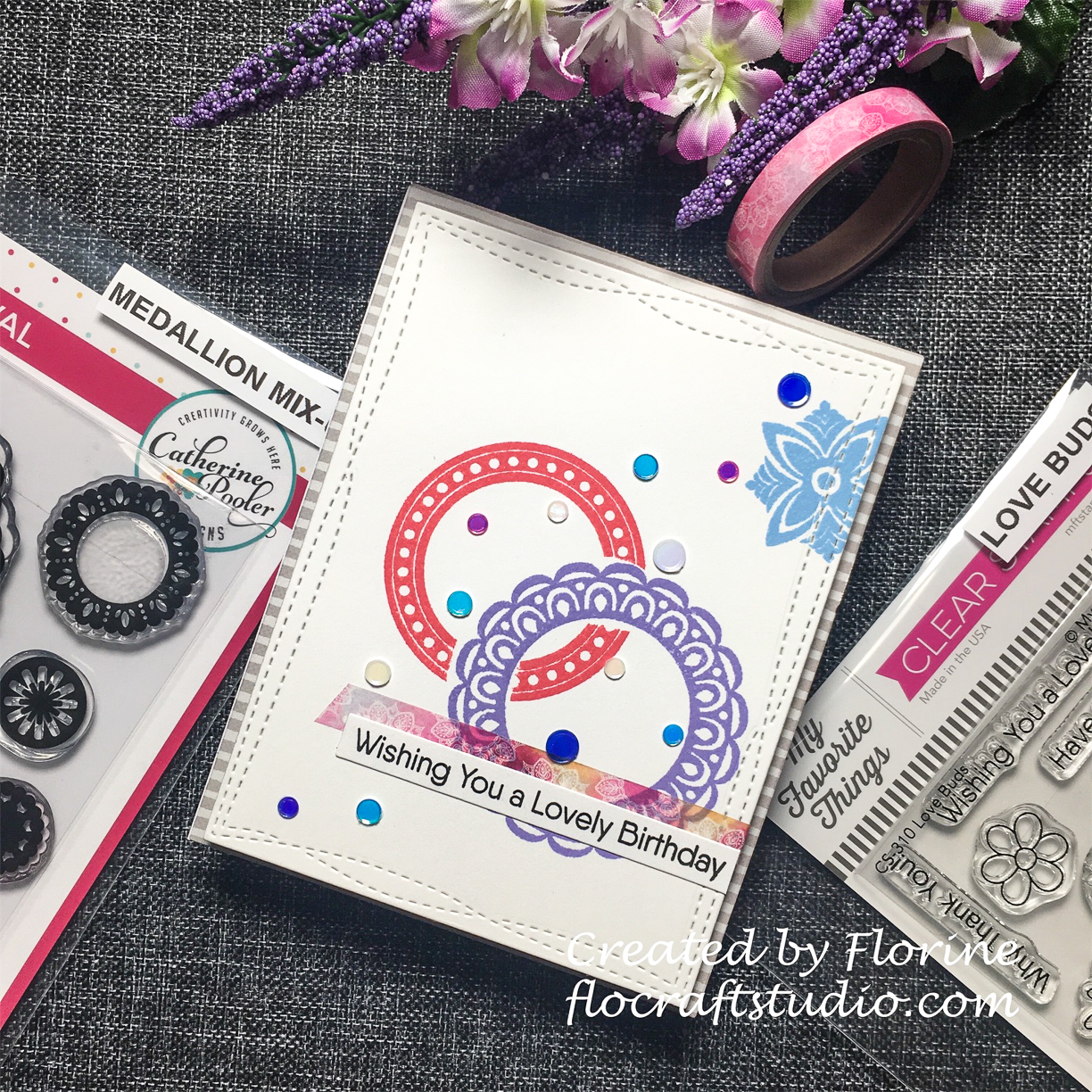 - I chose Altenew Crimson, Eastern Sky and Hydrangea ink cubes and used that to stamp the mandala’s I chose from Medallion Mix-Up stamp set from Catherine Pooler.