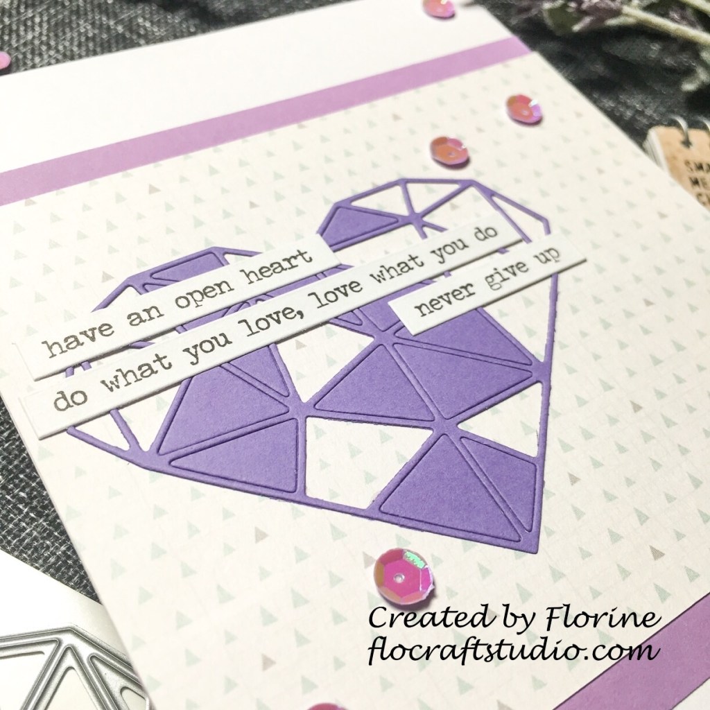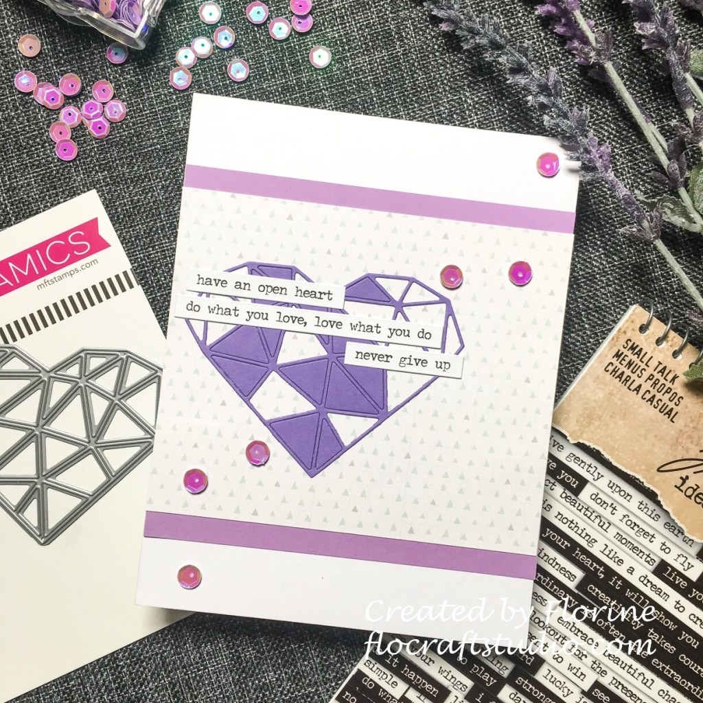 - Took a darker shade of purple card stock and used MFT Abstract Heart die leaving a few cut outs in place and adhered it on top of my triangles pattern paper.