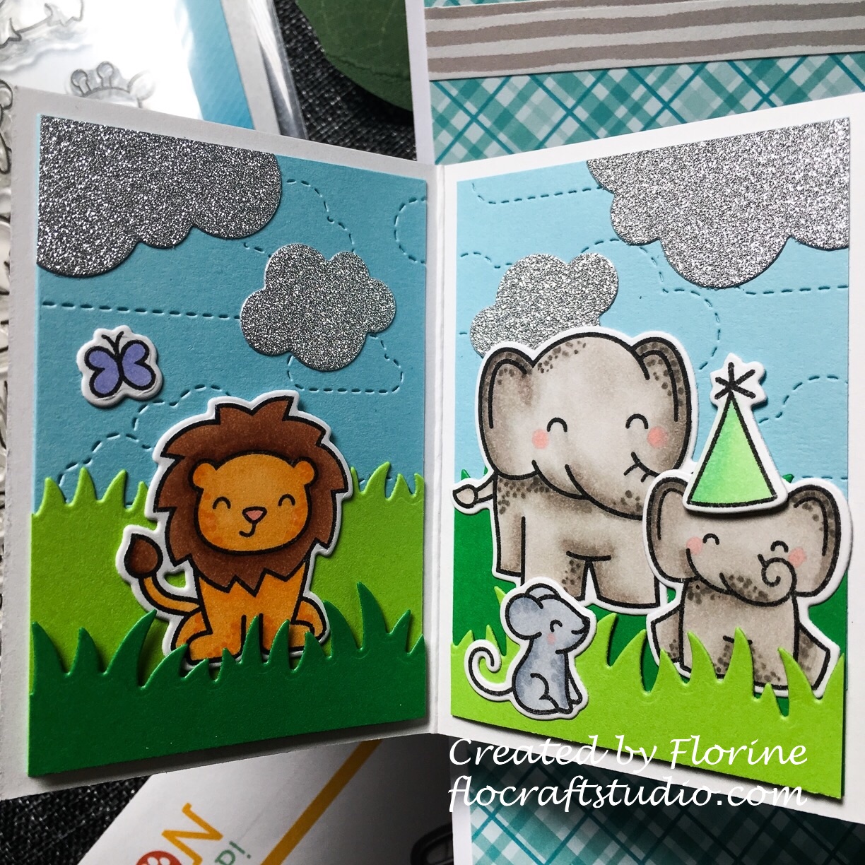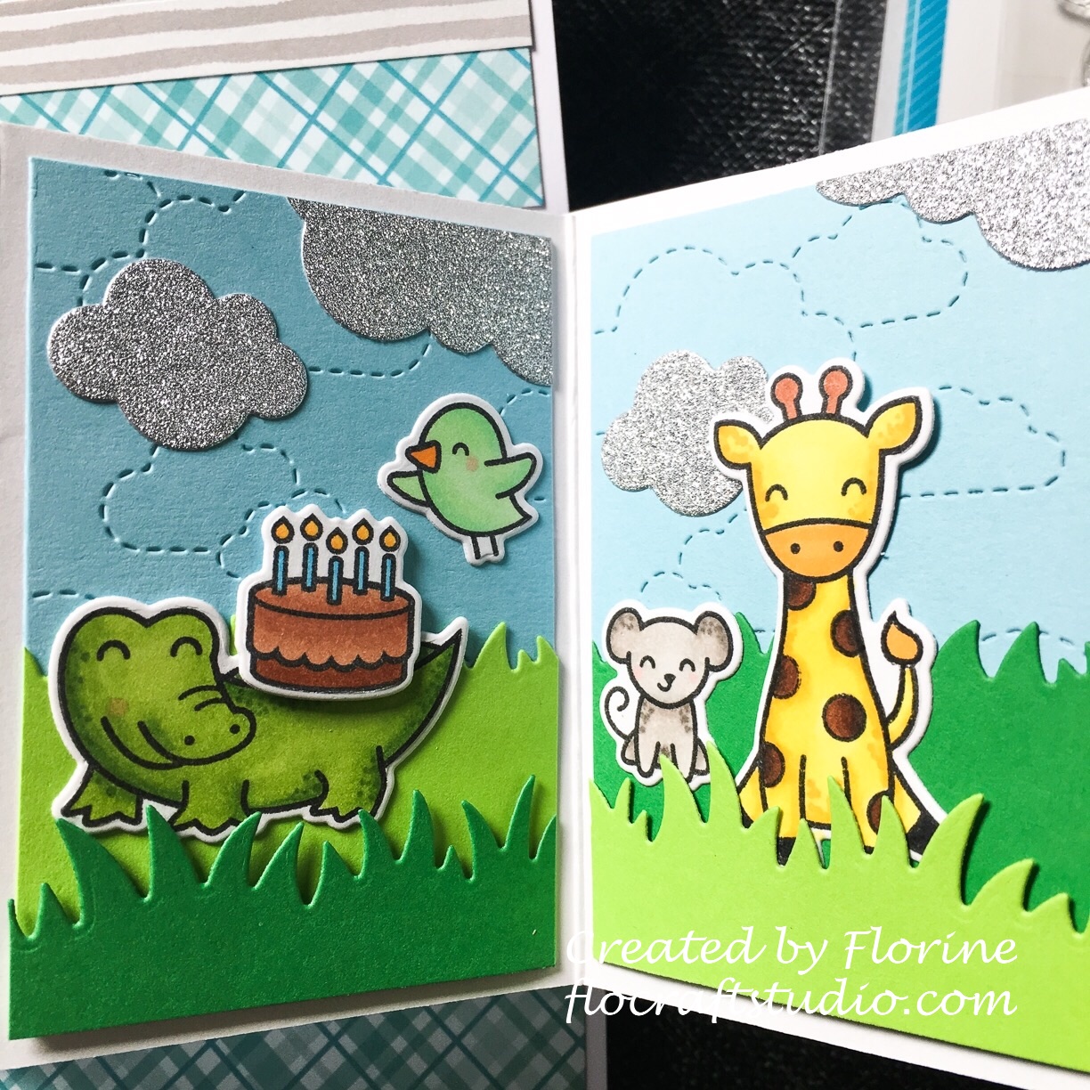 - I started to assemble the pop-up piece. First adhered a piece of Stitched Cloud Backdrop on every panel. Then I adhered the grass and the clouds. And last step was to adhered my chosen animals!