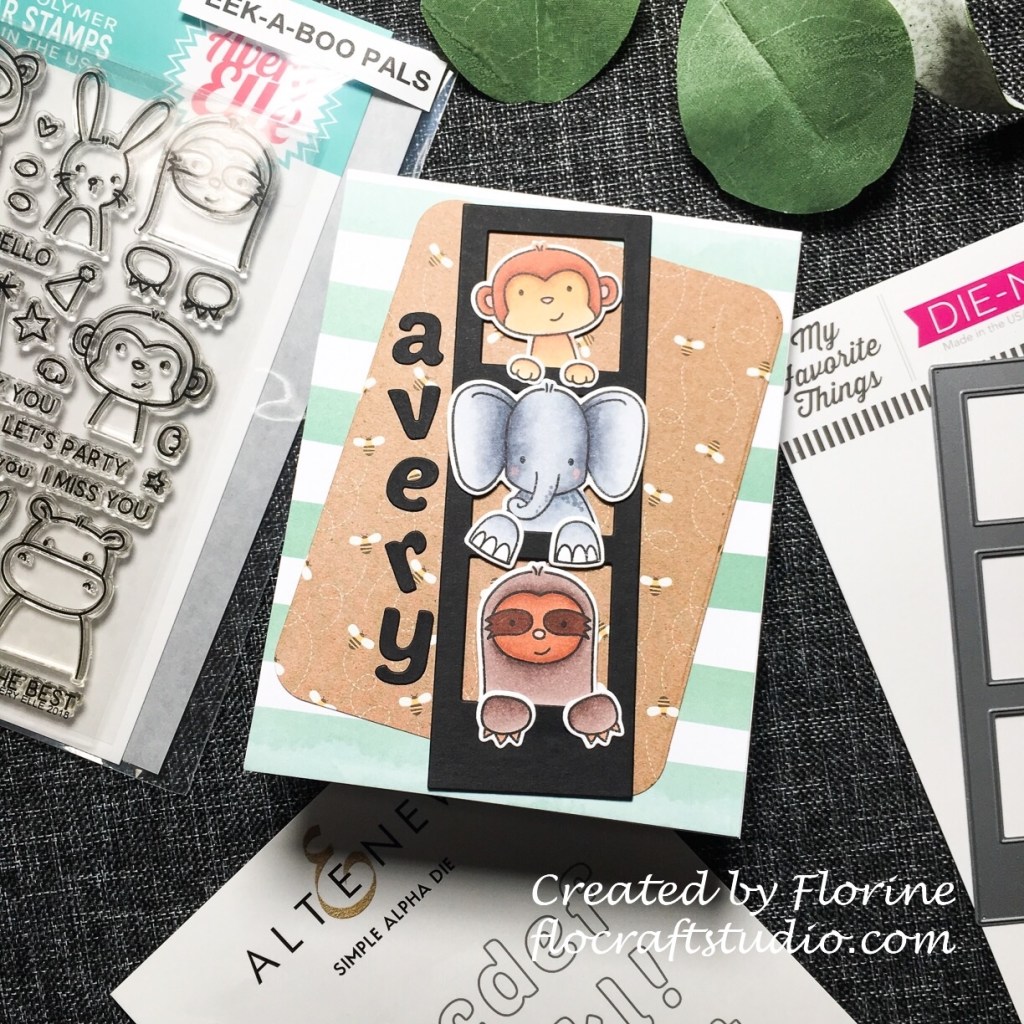- Die cut My Favorite Things photo booth strip 4 times, adhered 3 of them together and adhered it on my card base and also die cut the letters from Avery’s name using Altenew Simple Alpha Die and adhered it vertically right next to the photo booth strip and set it aside for now.