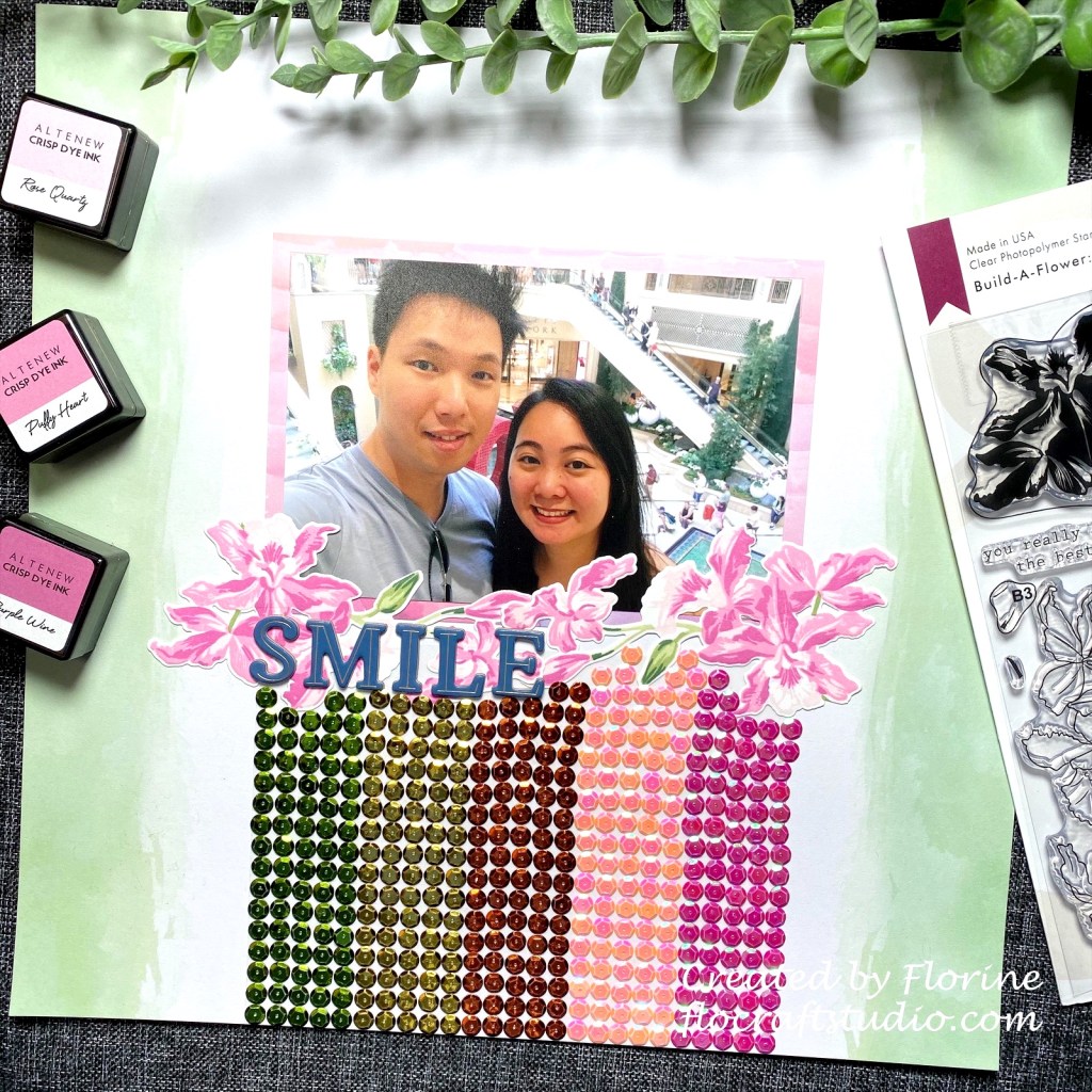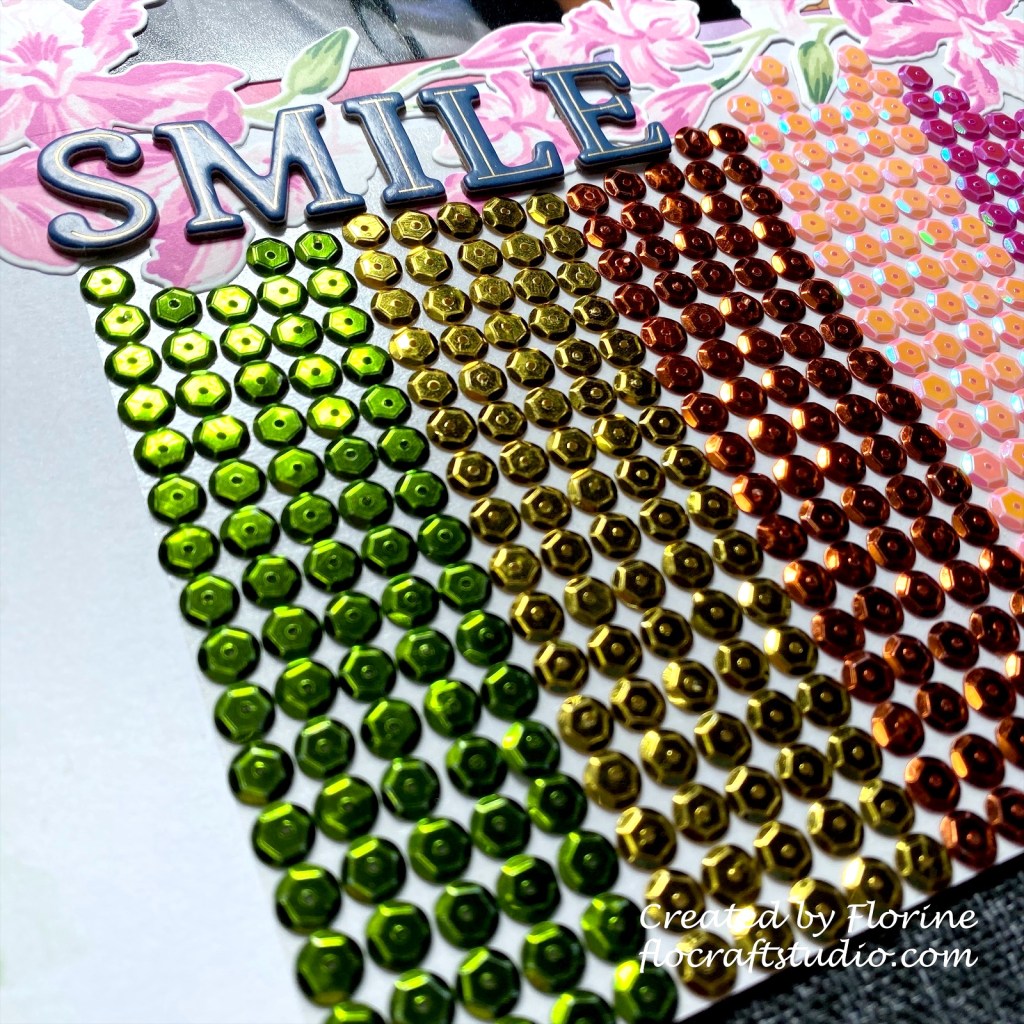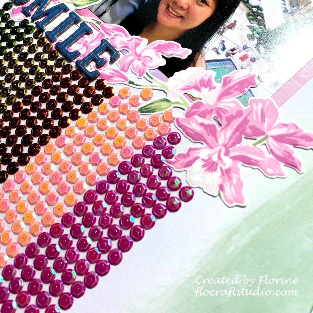 After I was finished with the Cattleya, I was thinking how to finish this page. I didn’t want to use ink or pattern paper so I decided to use the sequins that I barely use! Halfway through I was really hoping I had enough sequins haha. Instead of glueing these sequins one by one, i cut a piece of Couture Creations double sided tape and adhered it on my 12X12 scrapbook page. Choose the sequins color according to the challenge. The middle row looks like red but it’s actual orange. Finished off this page with chipboard alpha stickers from Pinkfresh Studio.