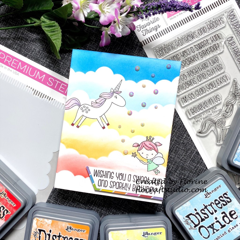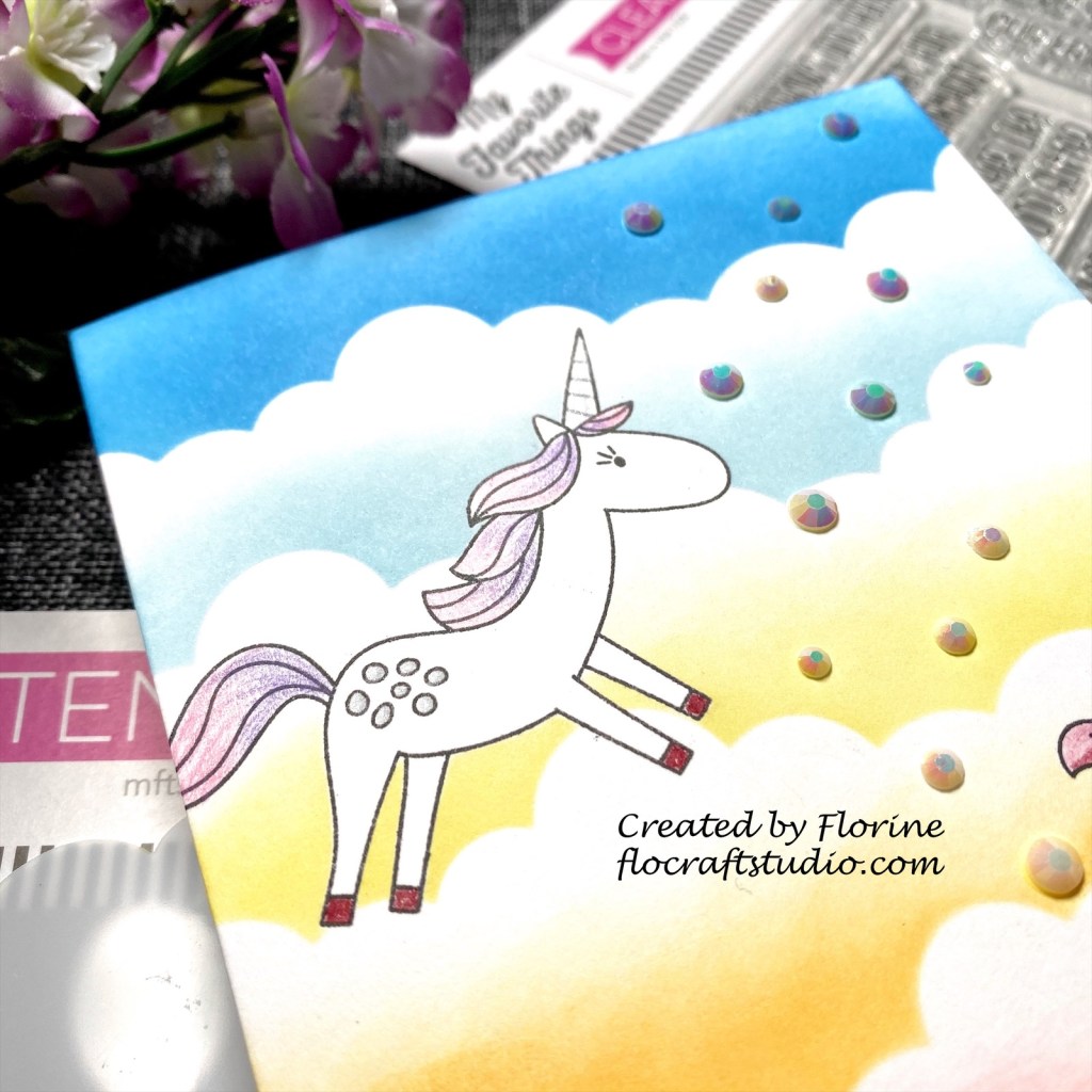 - I stamped the unicorn and fairy from MFT Rainbows & Unicorns stamp set directly on my Neenah Classic Crest Solar White Card Panel.
