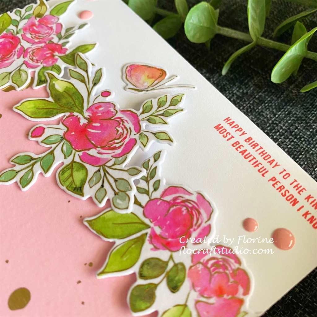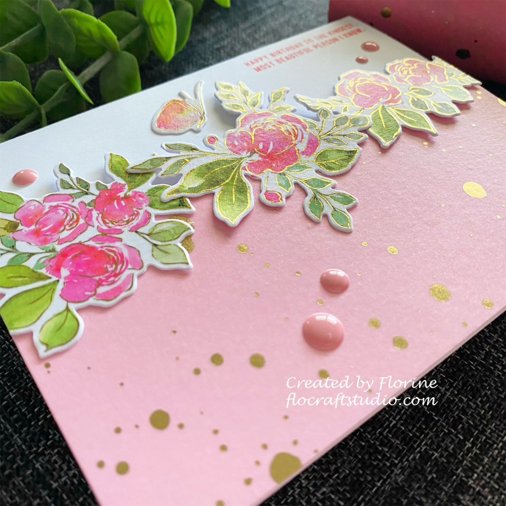 Hello my crafty friends! I want to share this very pink and gold floral card I made for the April 2021 Challenge from Pinkfresh Studio. Click here to visit their blog. The new washi tape I got from Pinkfresh Studio it’s so handy dandy that it comes with a coordinating die! I am so obsessed with the gold foil on the washi tape! So beautiful and elegant!
